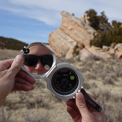 El Standard Transit mantiene toda la funcionalidad y características del clásico Brunton de bolsillo, pero ahora incorpora un cuerpo de aluminio anodizado duro y una base plana con insertos de silicona antideslizante.