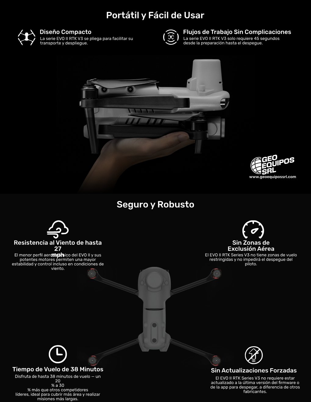 | Peso (con hélices y batería) | 1250 g ±0,5 g (EVO II Dual 640T RTK V3) / 1237 g ±0,5 g (EVO II Pro RTK V3) |