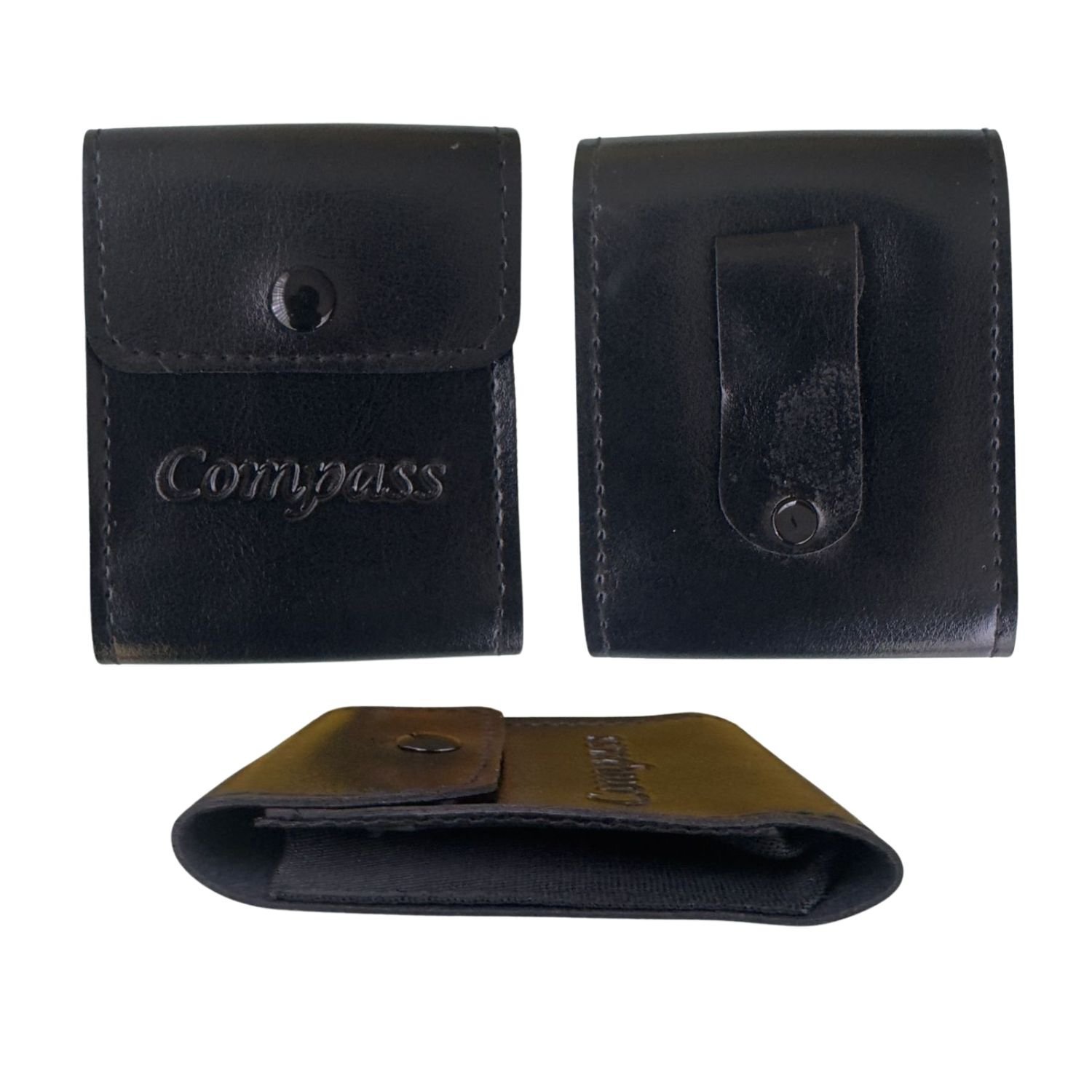 Estuche de cuerina delgada y flexible con acabado brillante, diseñado para proteger brújulas tipo Brunton. Su estructura ligera facilita el transporte sin añadir volumen adicional. Cuenta con cierre de botón a presión y el logo «Compass» grabado en la parte frontal.