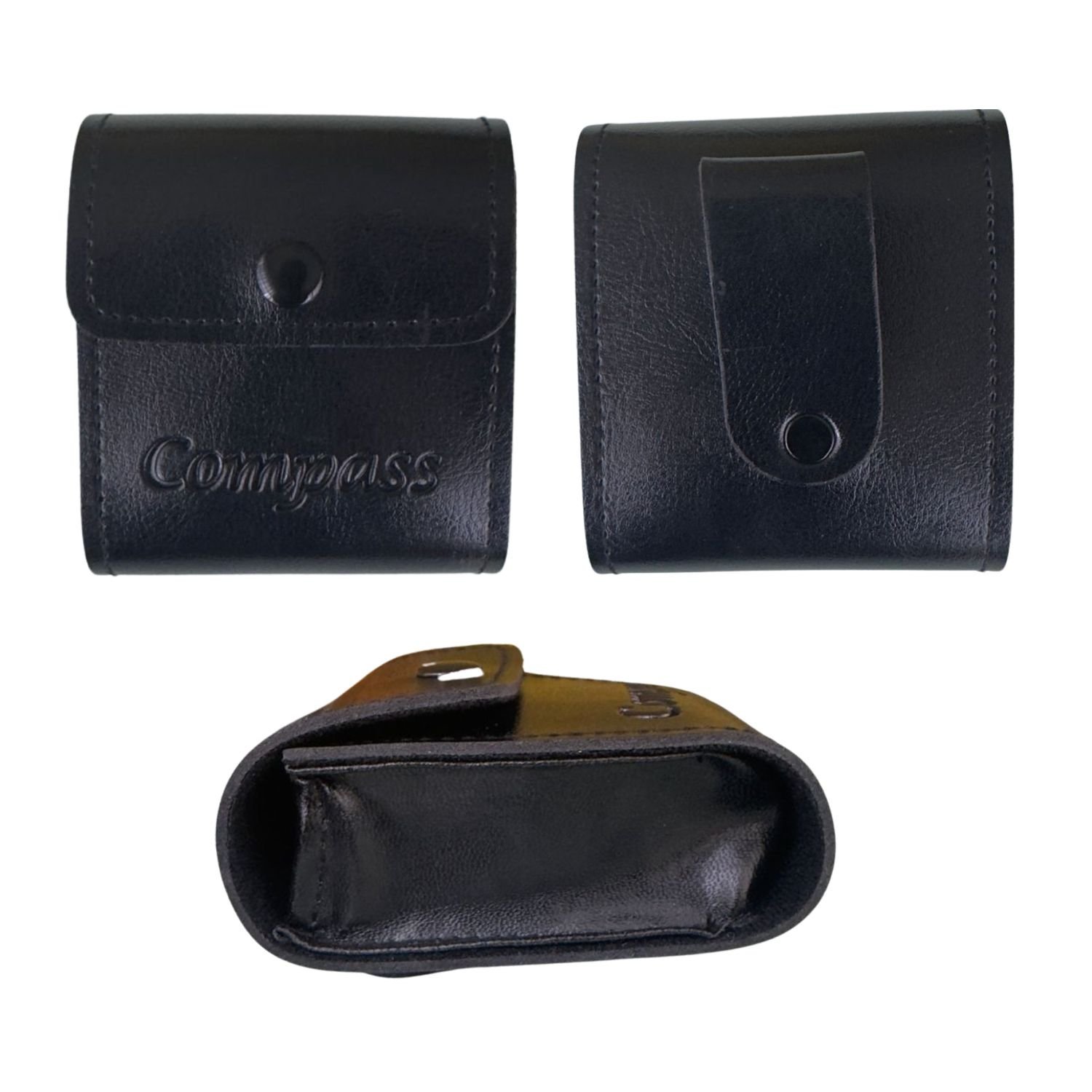 Estuche de cuerina con estructura flexible y acabado brillante, diseñado para proteger brújulas tipo Brunton. Su material flexible facilita su manipulación y almacenamiento sin comprometer la seguridad de la brújula. Incluye cierre de botón a presión. Cuenta con el logo «Compass» grabado en la parte frontal.