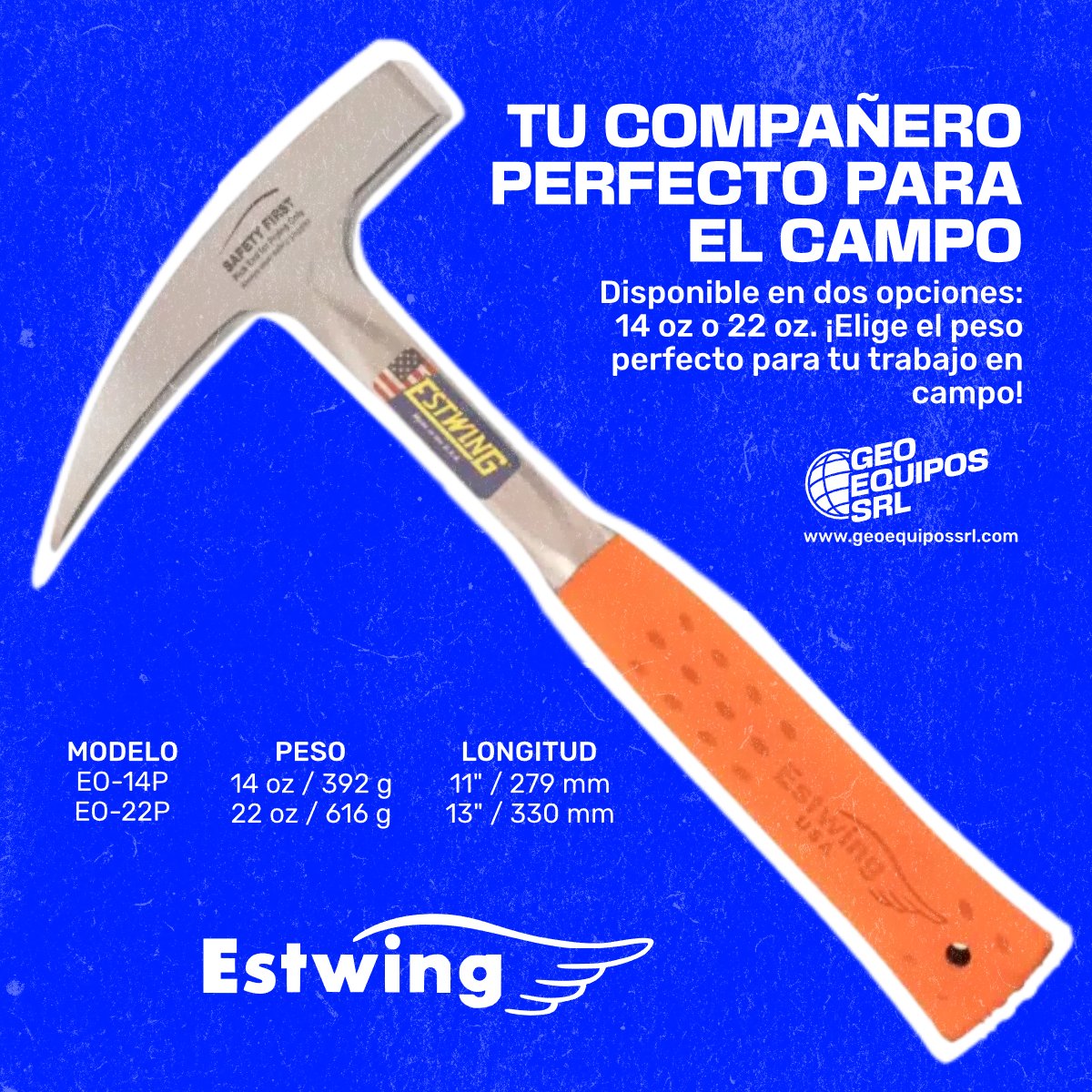 El Martillo Cateador Punta Pico de 22 onzas Mango de Vinil Naranja Estwing (EO-22P) es una herramienta robusta y confiable diseñada para geólogos y profesionales del campo. Fabricado en una sola pieza de acero sólido con un mango Shock Reduction Grip® en color naranja, este martillo combina durabilidad y comodidad, reduciendo las vibraciones causadas por el impacto y garantizando un manejo preciso incluso en las condiciones más exigentes.